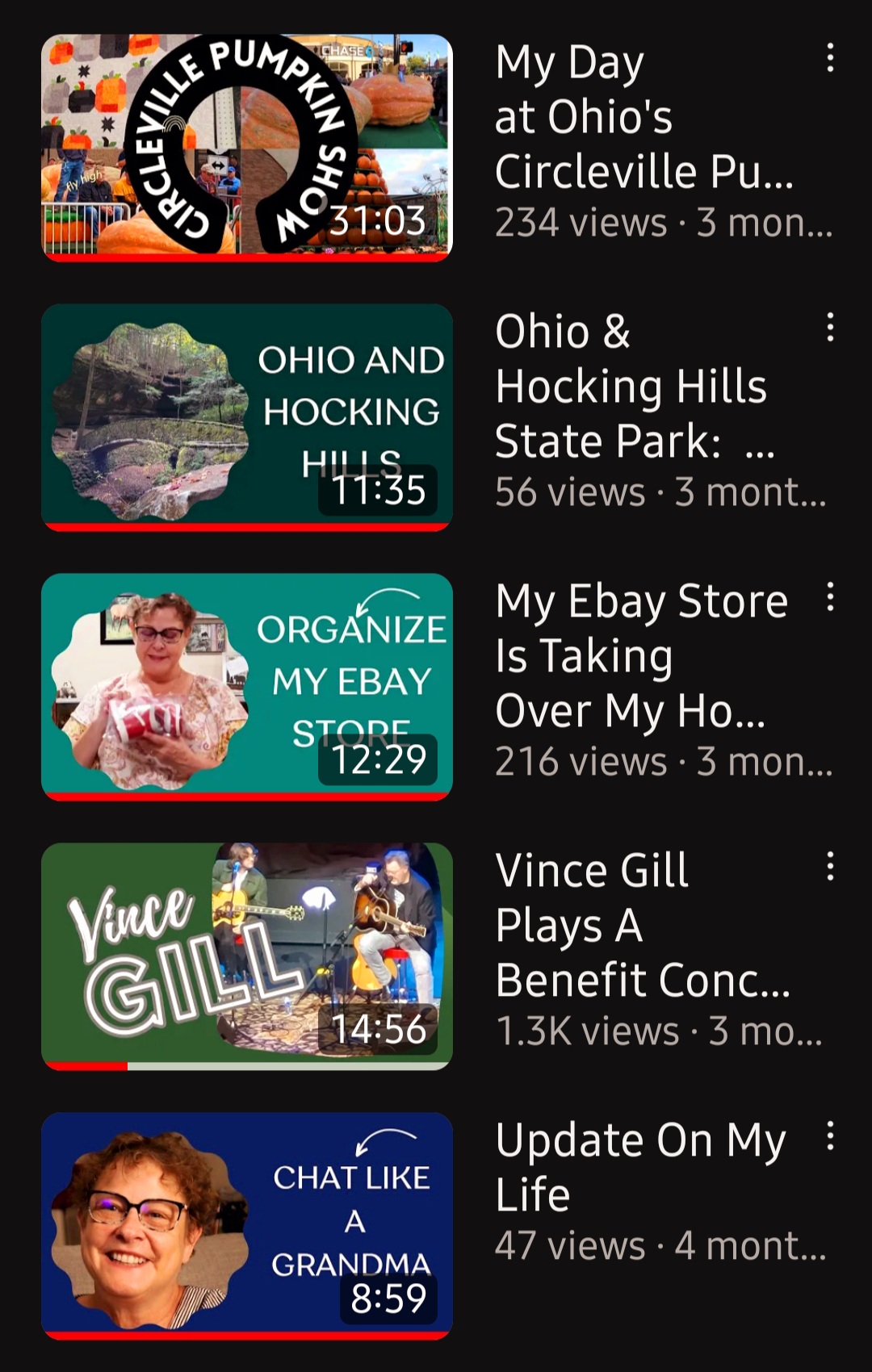 The nice thing about documenting my life on video is looking back and watching some of my accomplishments. I videoed family, trips, and the mundane of life. I have enough shorts of my cat, Pippin, to laugh at. I started my ebay store and documented it. I videoed concerts I attended when I volunteer usher, and some general thoughts about my life around my home.